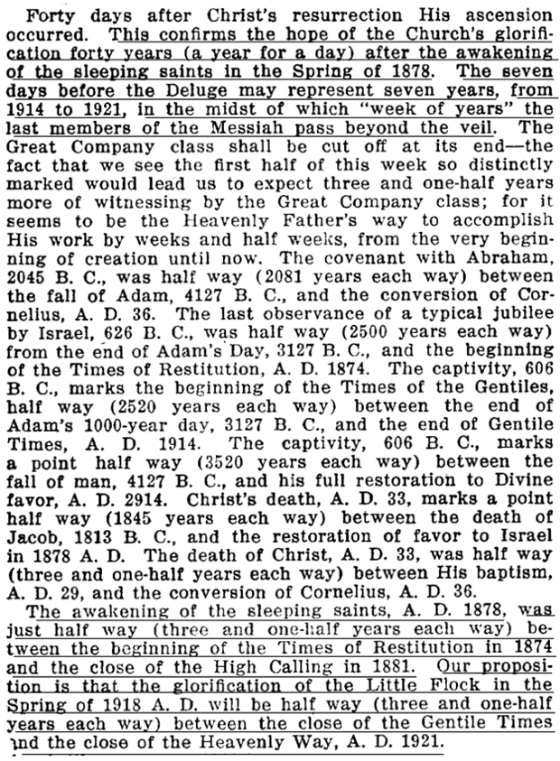 Huolimatta ankarista vaatimuksista olla "uskollinen" Pastori Russelin opetuksia ja ajanlaskua kohtaan tämä vuoden 1922 konventtipuhe on merkittävä, sillä se paljastaa ensimmäisen merkin siitä, miten juuri noista opetuksista alettiin hivuttautua vähitellen pois. Kirjassa Aika on lähellä Russell oli opettanut, että "vuosi 1878, joka on rinnakkainen sille, kun hän [Kristus] sai voiman ja vallan esikuvassa, merkitsee selvästi aikaa, jolloin läsnäoleva, hengellinen ja näkymätön Herramme todella sai vallan kuninkaiden Kuninkaana – se oli aika, jolloin hän otti suuren valtansa alkaakseen hallita." Rutherfordin Cedar Pointissa esitettyyn puheeseen mennessä nuo tapahtumat – näkymättömät tapahtumat – siirrettiin vuodesta 1878 vuoteen 1914, eli vuoteen, joka ei ollut täyttänyt mitään sille asetetuista ennustuksista tai toiveista. Tämä oli sen kehitysvaiheen alku, joka myöhemmin miltei täysin siirsi sellaiset tapahtumat vuoteen 1914 ja sen jälkeisiin vuosiin, jotka oli aiemmin ajoitettu eri vuosille ennen vuotta 1914. Sopusoinnussa Miljoonat jotka nyt eivät kuole koskaan -kirjasen kanssa järjestö opetti nyt, että riemuvuosijakso (jotka Mooseksen lain mukaan kattoivat 50 vuoden peräkkäisiä jaksoja ja jokainen 50. vuosi oli riemuvuosi) osoitti vuoteen 1925 aikana, jolloin Kristuksen hallinto tulisi täysin ilmeiseksi ja vanhan ajan profeetat palaisivat maan päälle. Vuonna 1924 järjestö julkaisi kirjasen nimeltä Tie paratiisiin, joka oli suunniteltu nuorten käytettäväksi. Huomaa, miten luottavaisesti nämä ennustukset esitettiin noille nuorille mielille. Ne sisälsivät kuvauksen maallisesta Jerusalemista, joka olisi ennallistetun ihmiskunnan pääkaupunki: ![]()