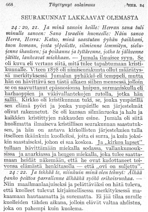 Russellin seuraajat pysyivät toiveikkaina kun Russell oli vielä elossa ja muutaman vuoden hänen kuolemansa jälkeenkin. Kun sota päättyi ja elämä alkoi palata normaaliksi, jokainen kuluva vuosi toi pintaan lisää kysymyksiä esitetystä ajanlaskusta. Tämän asiaintilan Tuomari Rutherford peri itselleen. (Hänet oli valittu Seuran presidentiksi yhdistyksen vuosikokouksessa tammikuussa 1917.) Hänellä oli kaksi vaihtoehtoa: Korjata asiat myöntämällä virheet rehellisesti tai yrittää perustella edeltäjänsä ennustuksia. Hän valitsi perustelun tien. Rutherford toimi nopeasti elvyttääkseen Vartiotornin lukijoiden mahdollisesti hiipuvan luottamuksen ja järjesti, että kirja nimeltä Täyttynyt Salaisuus julkaistaisiin Russellin kuolemaa seuraavana vuonna 1917. Tämä kirja pyrki siirtämään joitakin vuoden 1914 odotuksia vuoteen 1918 ja teki sen kehittämällä rinnakkaisuuden juutalaisten kapinalle, jonka roomalaiset kukistivat. Roomalaiset tuhosivat Jerusalemin vuonna 70 jaa., mutta taistelu loppui vasta 3,5 vuotta myöhemmin vuonna 73 jaa. Tämä sama aika siten lisättiin vuoden 1914 syksyyn, ja Täyttynyt Salaisuus viittasi nyt kevääseen 1918 uutena ajankohtana, jolla olisi dramaattinen merkitys. Kirjan tekstin alleviivatut osuudet näyttävät, mitä nyt ennustettiin tapahtuvan. Kun luet niitä, pane merkille millaista kieltä käytetään ja pohdi tätä: Jos joku sanoisi, että teksti sisältää selviä ennustuksia ja herättää tarkoituksellisesti odotuksia, jotka eivät koskaan toteutuneet, "lukisiko hän lausuntoja, joita ei ollut lainkaan esitetty", kuten edellisessä luvussa lainattu historiakirja myöhemmin totesi? (Seuraavilla sivuilla on lainaukset Täyttyneen Salaisuuden sekä englanninkielisestä että suomenkielisestä versiosta. Huomaa, miten suomenkielisessä kirjassa seuraavat vuosiluvut on jätetty tekstistä pois; sivulta 77: 1914-1921; sivulta 362: 1920; sivulta 363: 1917-1920; sivulta 668: 1918; sivulta 669: 1918; sivulta 705: 1918; sivulta 745: 1920; sekä virhe sivulla 73: Luku 50 pitäisi olla 70. suom. huom.) —————— 1 Jesaja 5:20. ![]() ![]() ![]() Kirja ennusti myös, että "voideltujen" jäännös eli "Elia-luokan viimeiset" jäsenet tulisivat kokemaan siirtymisensä taivaaseen tuonna vuonna, kuten sivulla 64 (suom. s. 77-78) sanotaan: ![]() ![]() ![]() Kuten vuotta 1881 koskeva samanlainen ennustus, tämäkin meni vikaan. Ehkä kaikkein voimakkainta kieltä käytettiin ennustuksessa kristikunnan kirkkojen ja niiden jäsenten hirveästä tuhosta vuonna 1918: Heidän kuolleet ruumiinsa olisivat levällään hautaamattomina. Kirjassa on useita esimerkkejä tästä profetiasta, sivuilla 484 ja 485 (suom. s. 668, 669) on kaksi niistä: ![]() ![]() ![]() ![]() ![]() ![]() Eivät ainoastaan kristikunnan kirkot, vaan myös sen hallitukset tulisivat kohtaamaan katastrofin ja unohduksen. ![]() ![]() Kaikkien näiden asioiden ennustettiin tapahtuvan vuonna 1918. Yksikään niistä ei toteutunut. Mutta kirja myös ennusti ällistyttäviä tapahtumia vuodelle 1920. Ne jättimäiset vallankumouset, joiden oli määrä alkaa vuonna 1918, saavuttaisivat huipentuman vuonna 1920, jolloin kaikenlaiset hallitukset katoaisivat: ![]() ![]() ![]() Niinpä jopa ne radikaalit ainekset, jotka aiheuttaisivat vallankumoukset kristikunnassa vuonna 1918 ja panisivat alulle työläis- ja sosialistiset hallitukset, näkisivät noiden liikkeiden kohtaavan loppunsa. Näin kävisi, sillä vaikka noiden liikkeiden oli määrä kukistaa kristikunnan olemassaolevat hallitukset, ne itse tulisivat anarkistien kaatamiksi vuonna 1920: ![]() ![]() ![]() "Maailmanlaajuinen anarkia syksyllä 1920." Kaikesta silmiinpistävästä kielestä ja väittämien varmuudesta huolimatta mitään ei tapahtunut. Kuten vuonna 1914, uudet ajankohdat 1918 ja 1920 tulivat ja menivät ilman ennustettuja tapahtumia. Kristikunnan "tuskankouristuksia" ei tullut, sen hallituksia ei kukistettu eikä kirkkoja tuhottu, miljoonia sen jäseniä ei teurastettu eikä voideltuja otettu taivaaseen. Sen sijaan vuonna 1918 Presidentti Rutherford ja kuusi muuta Seuran johtavaa virkailijaa haastettiin oikeuteen ja pantiin vankilaan sodanaikaisten syytteiden pohjalta, joiden mukaan Täyttynyt Salaisuus -kirja ja muut julkaisut sisälsivät kumouksellisia lausuntoja. Seuraavana vuonna 1919 heidät päästettiin vapaaksi ja vapautettiin kaikista syytteistä. ![]() Näin he olivat vapaalla jalalla näkemässä vuoden 1920, jonka syksyllä kaikki tasavallat ja "jokainen maan valtakunta" tulisi "niellyksi anarkiassa" Täyttynyt Salaisuus -kirjan mukaan. Tuohon vuoteen mennessä oli kuitenkin kehitetty ja julistettu jo uusia ennustuksia. Edes vuoden 1920 loppua ei odotettu, vaan esitettiin uusi ajankohta, jota odottaa.