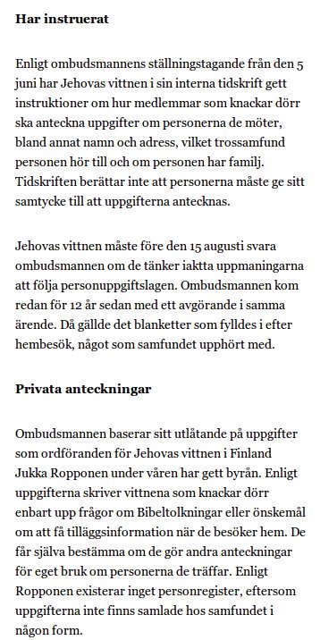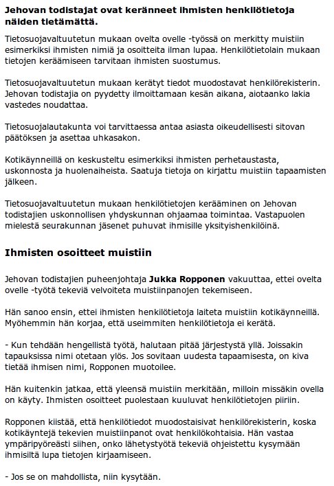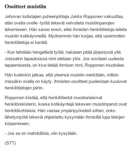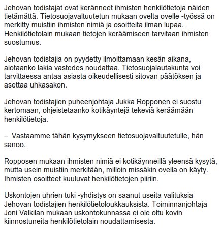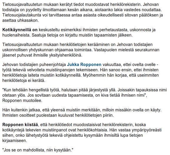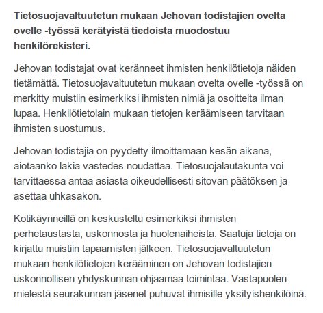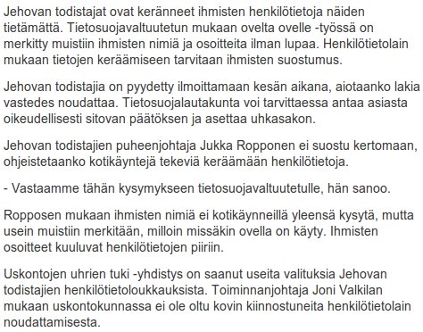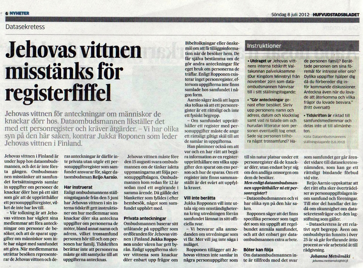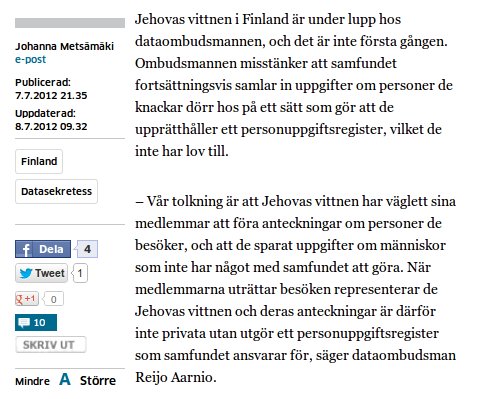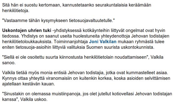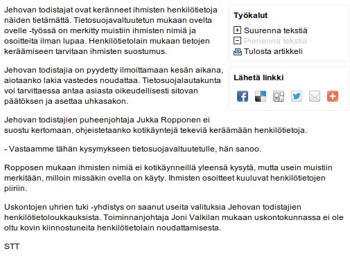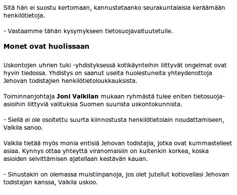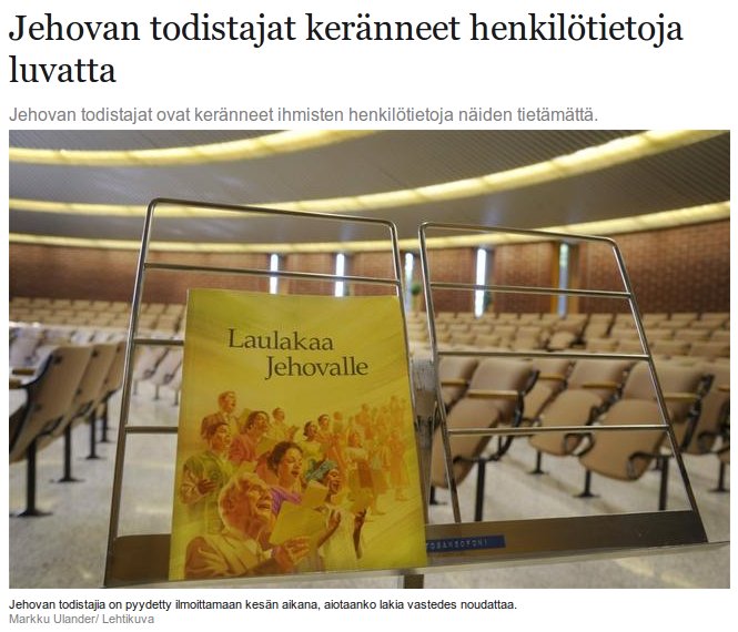 Tietosuojavaltuutettu vaatii Jehovan todistajia noudattamaan henkilötietolakia. Miten lehdistö on suhtautunut tähän asiaan? Melko monet tiedotusvälineet ovat julkaisseet oman uutisensa netissä. Tässä muutamia esimerkkejä: Kotimaa