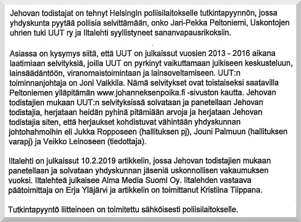 Tutkintapyynnön mukaan Uskontojen uhrien tuki ry:n toiminnanjohtaja Joni Valkila ja Jari-Pekka Peltoniemi ovat osallistuneet UUT:n verkkosivuilla saatavilla olevien selvitystöiden laatimiseen, jotka koskevat Jehovan todistajia. Tutkintapyynnön mukaan kuudessa vuosien 2013 - 2016 aikana laadituissa selvitystöissä solvataan ja panetellaan Jehovan todistajia, esitetään Jehovan todistajista valheellista tietoa ja vihjauksia, herjataan heidän pyhinä pitämiään arvoja ja herjataan Jehovan todistajia siten, että herjaukset kohdistuvat vähintään yhdyskunnan johtohahmoihin eli hallituksen puheenjohtajaan Jukka Ropposeen, hallituksen varapuheenjohtajaan Jouni Palmuun ja tiedottajaan Veikko Leinoseen. Tutkintapyynnön mukaan Peltoniemi on ylläpitänyt verkkosivua www.johanneksenpoika.fi, jossa mainittujen Jehovan todistajien johtohahmojen nimet ja kasvokuvat on julkaistu. Peltoniemi on tutkintapyynnön mukaan jakanut verkkosivullaan www.johanneksenpoika.fi Iltalehden 10.02.2019 julkaiseman artikkelin: "Ex-jäsen: 'Kyse on painostuksesta, joka johtaa rituaaliteurastuksiin' - lääkäritkin huolissaan Jehovan todistajien verikiellosta", johon Peltoniemeä on haastateltu. Tutkintapyynnön mukaan artikkelissa panetellaan ja solvatavaan yhdyskunnan jäseniä uskonnollisen vakaumuksen vuoksi ja rikotaan uskonrauhaa. Tutkintapyynnössä kerrotaan, että Iltalehden julkaisija on Alma Media Suomi Oy, vastaavana päätoimittajana on toiminut artikkelin julkaisuaikaan Erja Yläjärvi ja artikkelin on kirjoittanut toimittaja Kristiina Tiippana. Tutkintapyynnön mukaan Iltalehden julkaisijat ovat juridisesti vastuussa päätoimittajarikkomuksesta tuomitsemisen uhalla artikkelin sisällöstä ja Iltalehden lukijoiden artikkelin kommenttikentässä julkaisemista panettelevista ja solvaavista kommenteista. Tutkintapyynnössä pyydetään Helsingin poliisilaitosta selvittämään, onko UUT ry:tä, Jari-Pekka Peltoniemeä, Joni Valkilaa, Alma Media Suomi Oy:tä, Erja Yläjärveä tai Kristiina Tiippanaa syytä epäillä rikoksesta. Poliisi on nyt tutkinut asian? Oliko syytä epäillä rikoksista? Ei. Tutkinnanjohtajan päätös: Asiassa ei ole syytä epäillä rikosta. Esitutkintaa ei aloiteta.